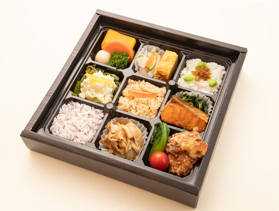 会議などにおすすめの彩豊かな9枡幕の内です。三種のごはんと鮭の幽庵焼き・鶏唐揚げを盛り込んだ幕の内タイプの仕出し弁当です。