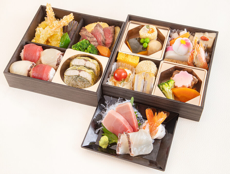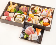 手毬寿司4貫、エビの天ぷら、厚切りローストビーフ、季節の煮物、角煮などが入ったお刺身付きの御膳 ※季節により副菜が変更になる場合がございます。 一段180×180×45mm