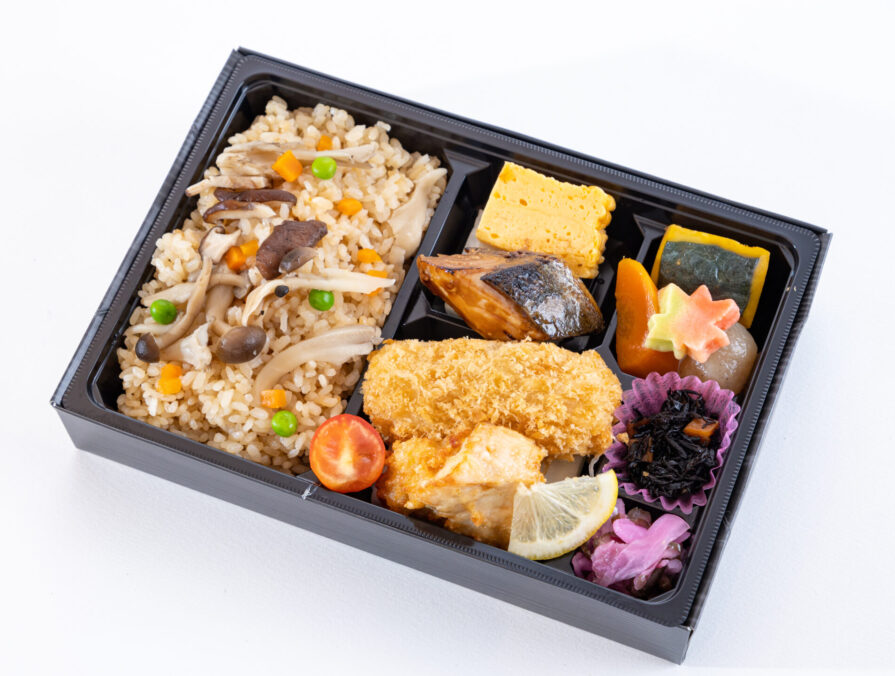 お出汁がしっかりと効いたきのこご飯と蟹クリームコロッケが自慢の仕出しお弁当。 冬を身近に感じられる贅沢なお弁当です。