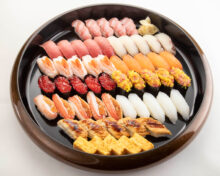 本鮪大トロ・中トロ・たい・えんがわ・サーモン・ズワイガニ・赤海老・すじこ・トロたく・穴子・玉子 お届け時は使い捨て容器にてお渡しいたします。 ※写真は五人前です。
