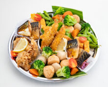 内容:海老チリ・春巻き・しゅうまい・ポテトサラダ・胡麻団子・肉団子・鶏唐揚げ・かに爪フライ・ブロッコリー・トマト・パプリカ