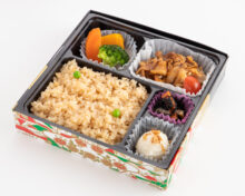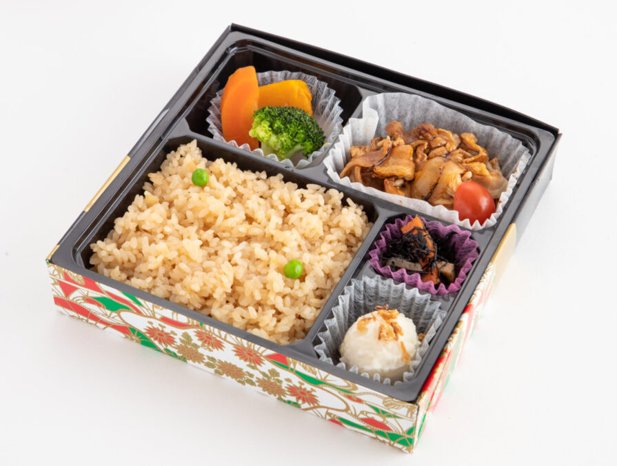 鯛出汁ごはんと生姜焼きを中心に手作りのお野菜の炊き合わせや玉子焼きを盛り込んだ幕の内タイプの仕出し弁当です。 ※季節により副菜が変更になる場合がございます。 195×195×40mm
