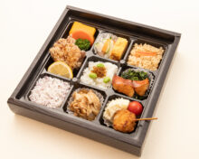 揚げ物がお好みの方のために、まぐろ串カツと鶏唐揚げを添えた味豊かな9枡幕の内タイプの仕出し弁当です。 ※季節により副菜が変更になる場合がございます。 242×242×40mm