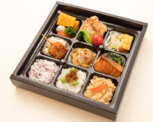揚げ物がお好みの方のために、まぐろ串カツと鶏唐揚げを添えた味豊かな9枡幕の内タイプの仕出し弁当です。 ※季節により副菜が変更になる場合がございます。 242×242×40mm