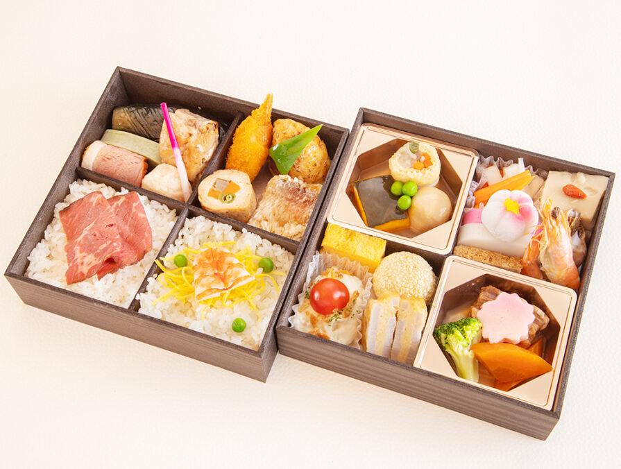 魚・肉・野菜料理、煮物・焼き物・揚げ物を盛り込んだ贅沢二段御膳な仕出し弁当です。大切なお集まりにご利用ください。