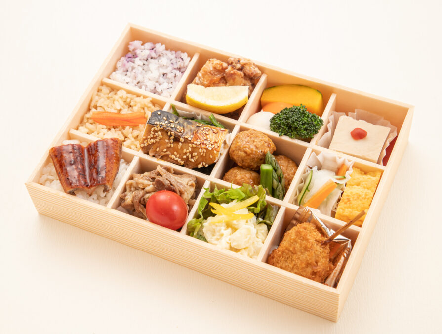 鰻ごはんと牛すき煮・鯖の南部焼き・まぐろ串カツ、そして和乃花の手作り旬菜をたっぷり詰め込んだ賑やかなプレミアム旬菜12枡の幕の内タイプの仕出し弁当です。