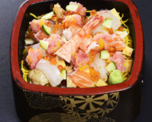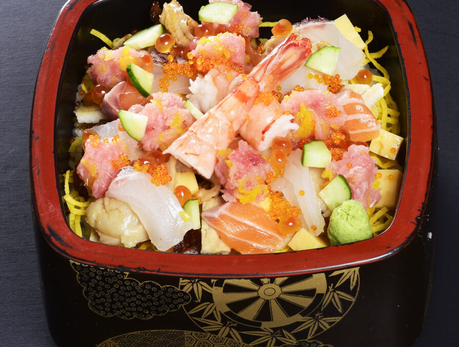 11種類のネタがシャリの上で咲き乱れ、見た目も華やかなちらし寿司です。 ご配達時には使い捨て容器にてご用意いたします。