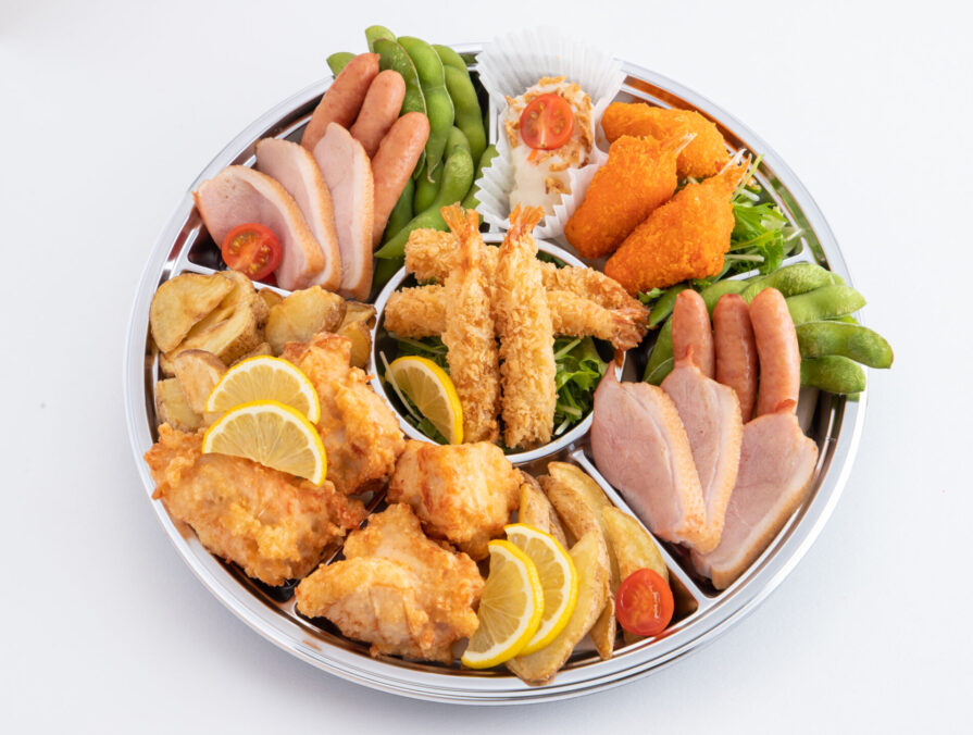 エビフライ・鴨ロース・唐揚げ・カニ爪フライ・ウインナー・ポテトフライ・枝豆が入った洋食オードブル(3-4人前)です。町内会の集まり、運動会、送別会、送別会、歓迎会、懇親会、忘年会、謝恩会など、様々なお集まりにて人気の商品です。