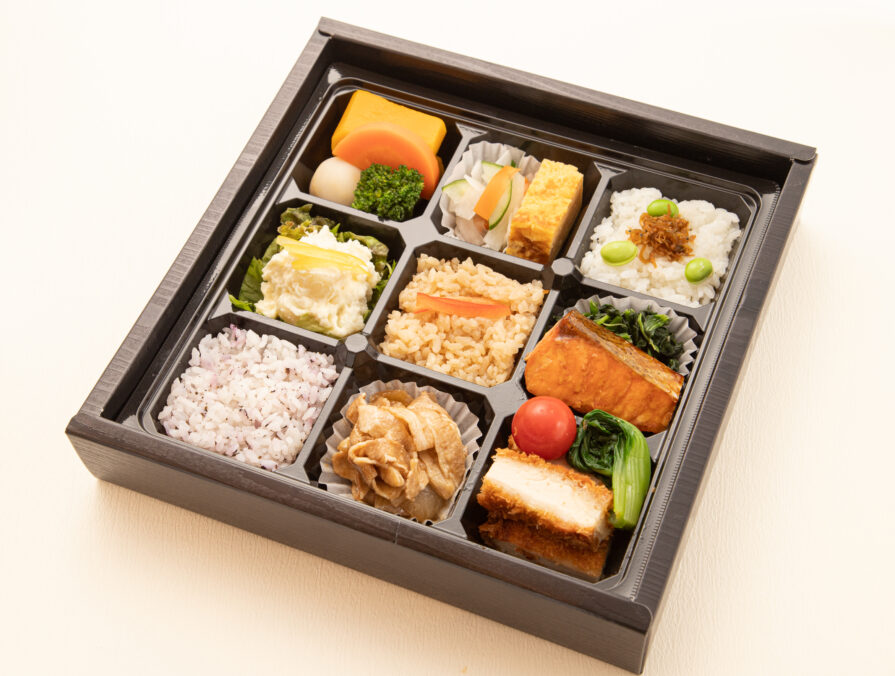 会議などにおすすめの彩豊かな9枡幕の内です。三種のごはんと鮭の幽庵焼き・チキンカツを盛り込んだ幕の内タイプの仕出し弁当です。