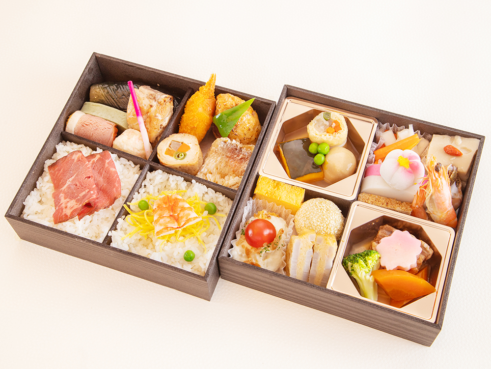 和乃花特製おかずをふんだんに詰め合わせた豪華な二段重。お寺での大人数の会食におすすめ。