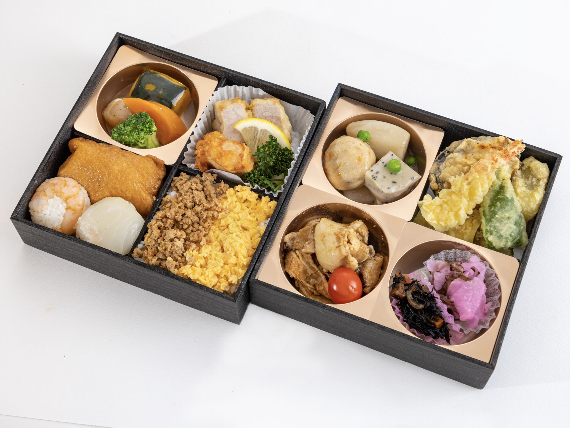 上段にはそぼろご飯と稲荷寿司、手毬ずしを彩りよく盛り付け。
